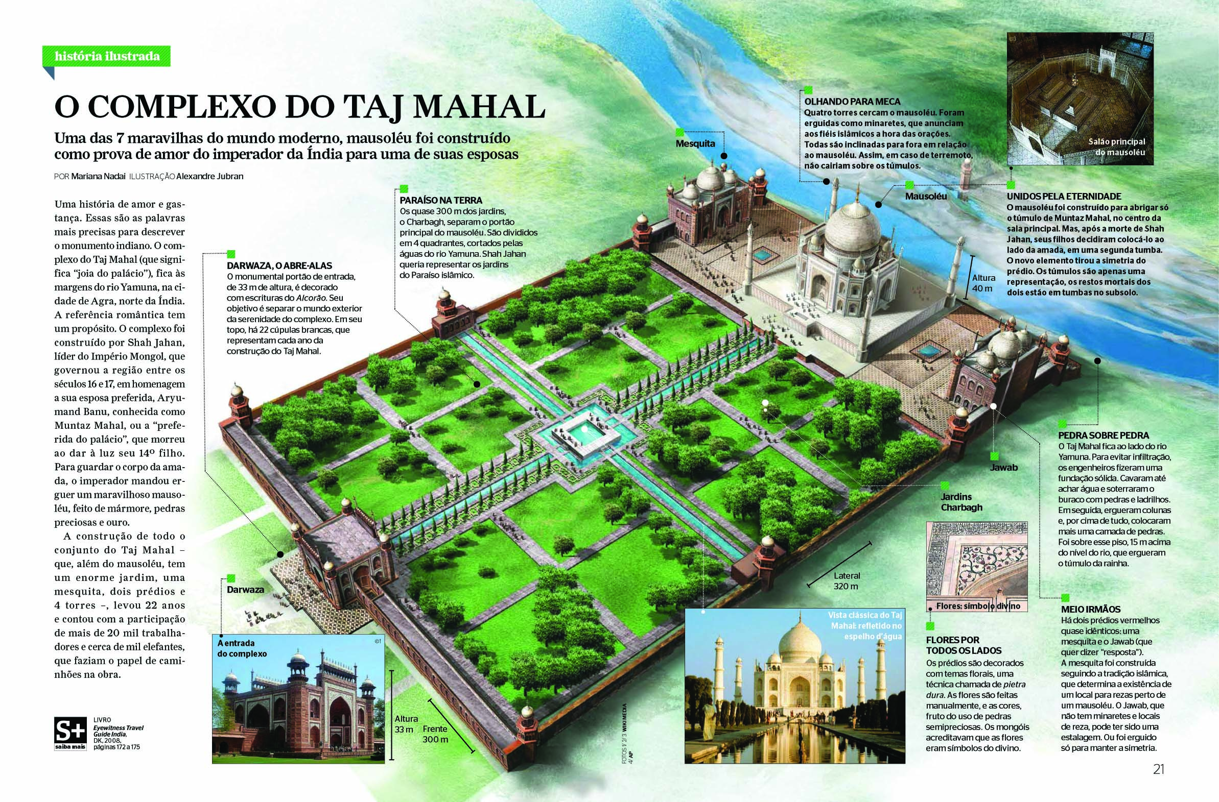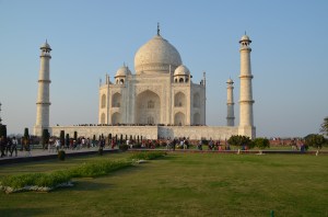 O Mais fascinante mausoléu do mundo definitivamente não poderia ser um e sim dois…. Esse era projeto do Imperador Shah Jahan, construir dois mausoléus, o que foi construído, o atual Taj Mahal, todo em mármore branco para a esposa e do outro lado do rio seria construído um idêntico de mármore negro para quando ele morresse. Cercado de uma história de amor e dor, é parte de um romance que qualquer ser humano fica apaixonado por sua história. Ao dar a Luz ao 14º filho, Aryumand Banu Begam, a mãe Mumtaz Mahal, a qual era carinhosamente chamada de a jóia do palácio, faleceu e em sua homenagem, mandou construir o TAJ. Conhecido como a maior prova de amor do mundo, é uma obra que contem além de fios de ouro, pedras semi preciosas.