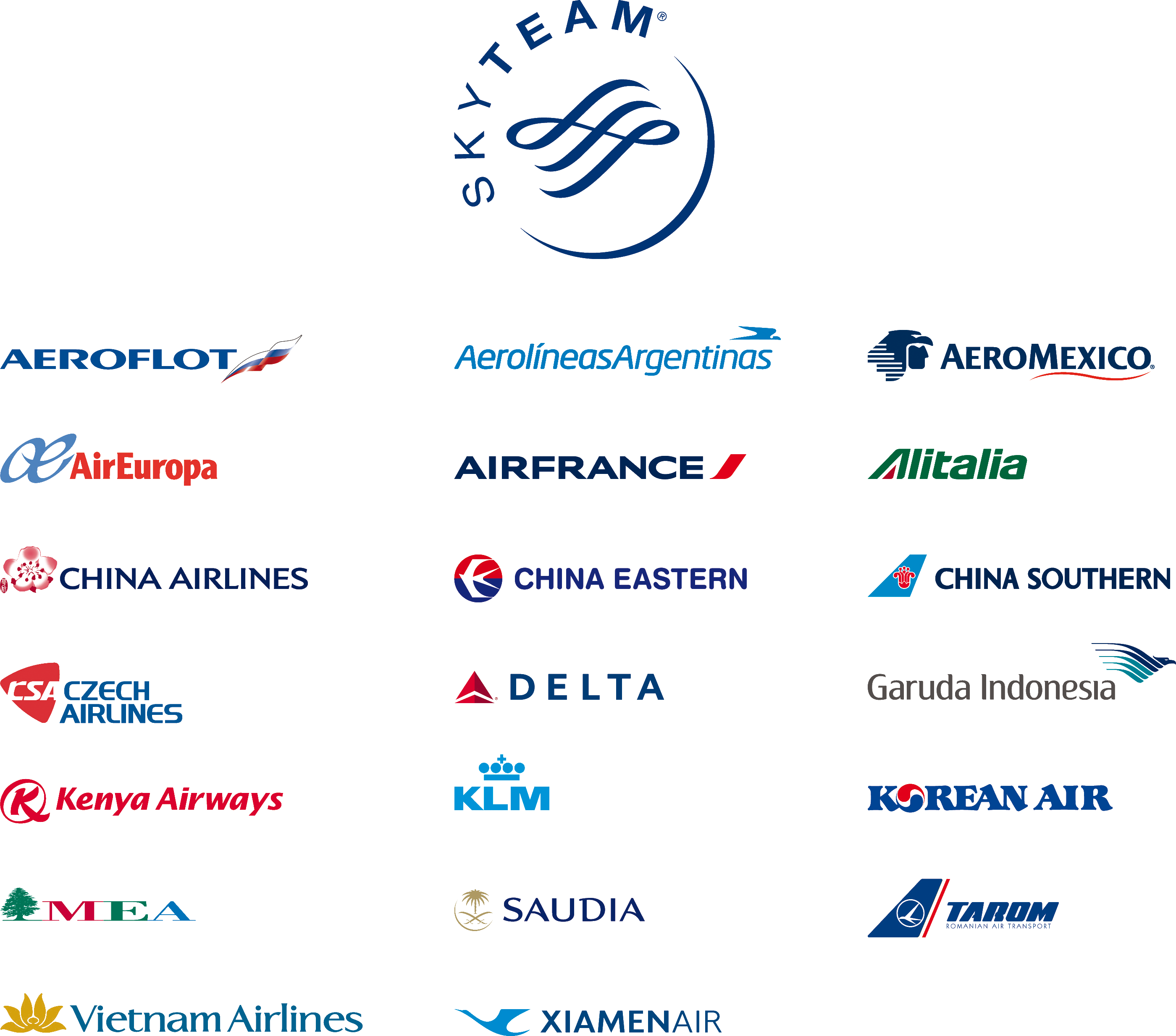 Aeroflot – Russia/ Aerolineas-Argentina/Aeromexico /Air Europa-Epanha/AIrFrance -/Alitalia/China Airlines, China Eastern, ChinaSouthern, Xiamen – China/Czech -Rep. Tcheca/Delta-USA/Kenya Ariways/KLM-Holanda/KoreanAir/MEA-Libano/Saudi-Arabia Saudita/Taron-Romenia/Veitnan Airlines e Xiamenair.